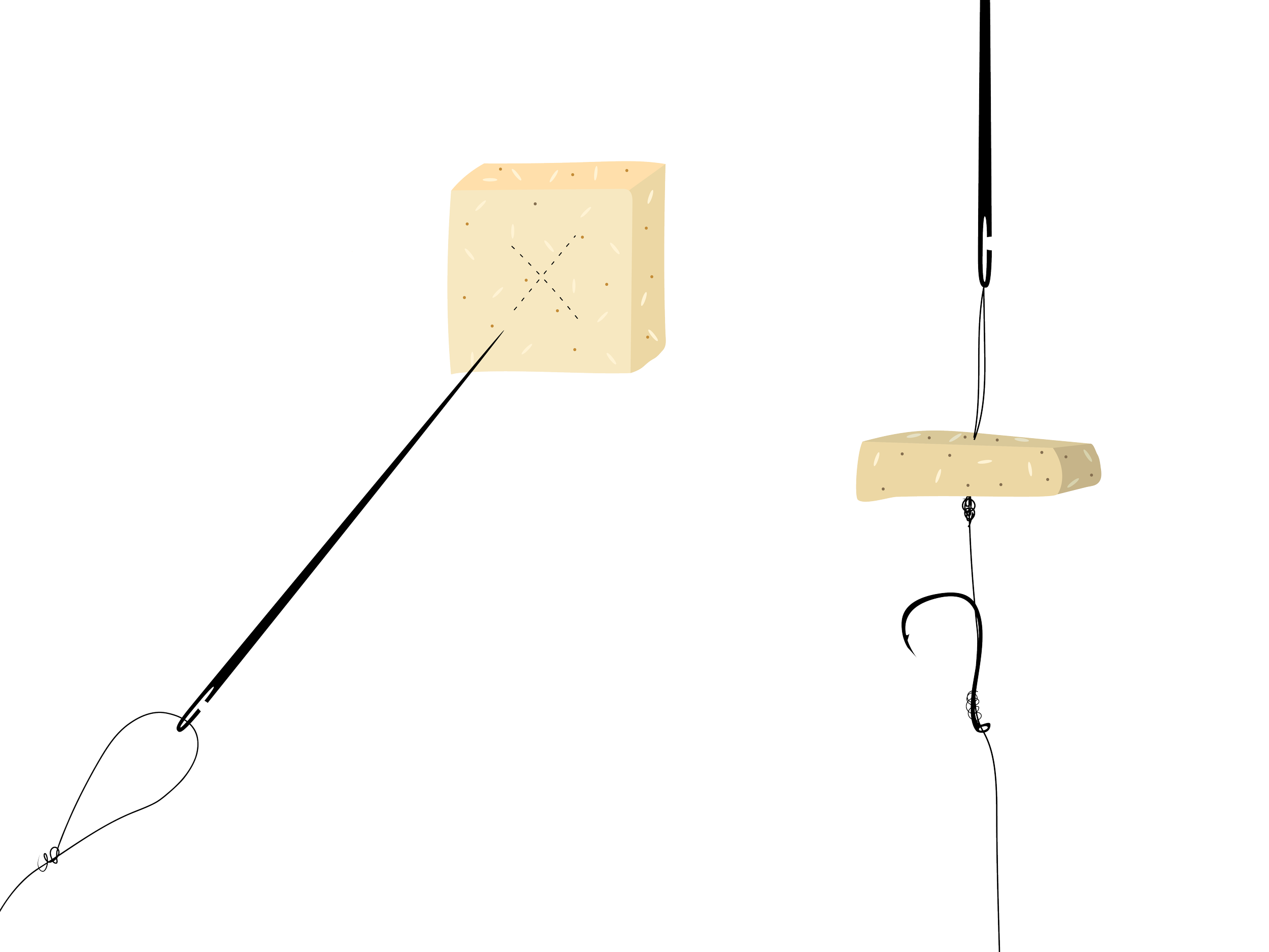 Next, choose a piece of bait, and pierce it with the needle in the center of the bait’s flat slide. Slide your bait all the way down the needle, onto the loop, and until it rests on the knot.
